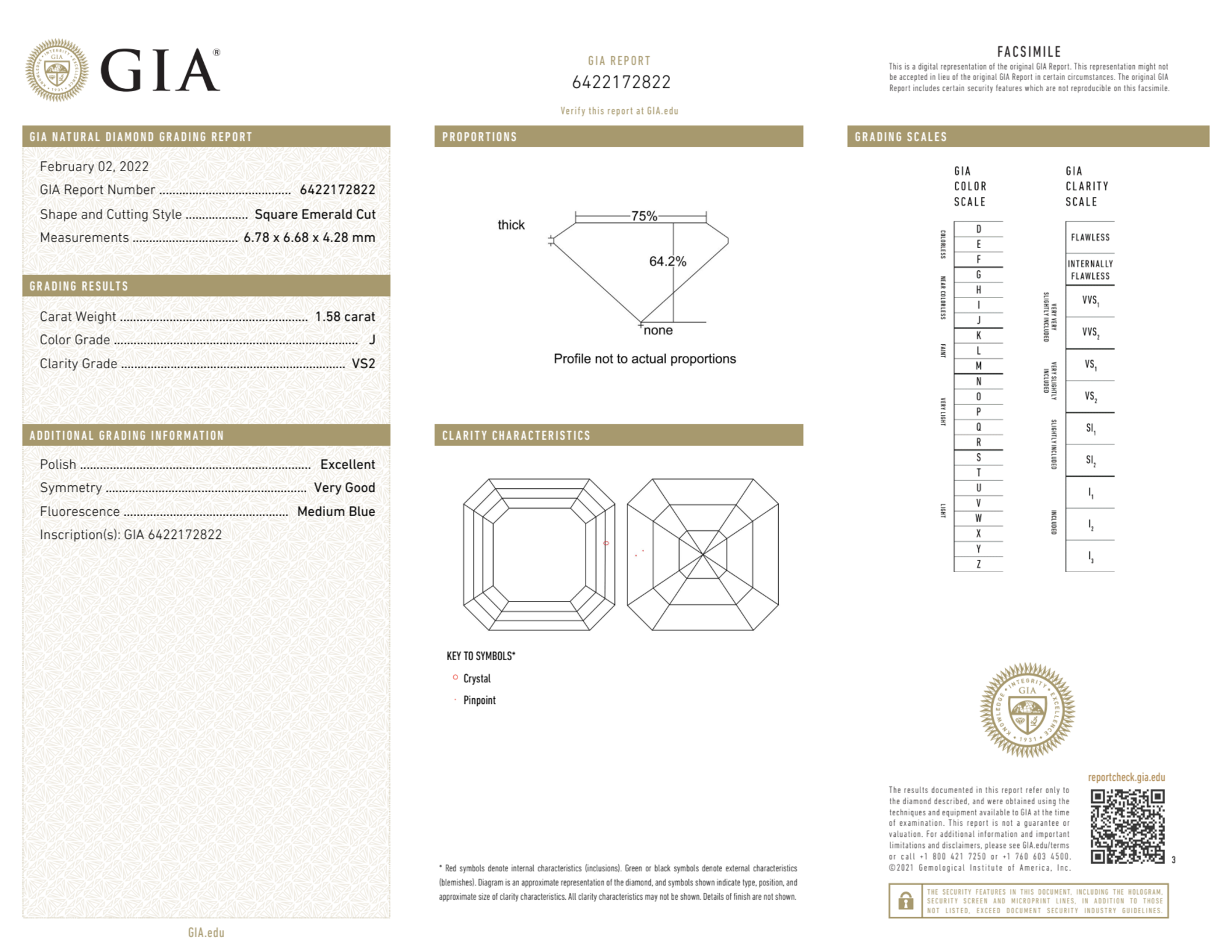 Your 1.58 carat Asscher natural diamond is graded VS2 clarity, which stands for Very Slightly Included 2. Read more about VS2 clarity diamonds here, or learn more about diamond clarity in general here.
