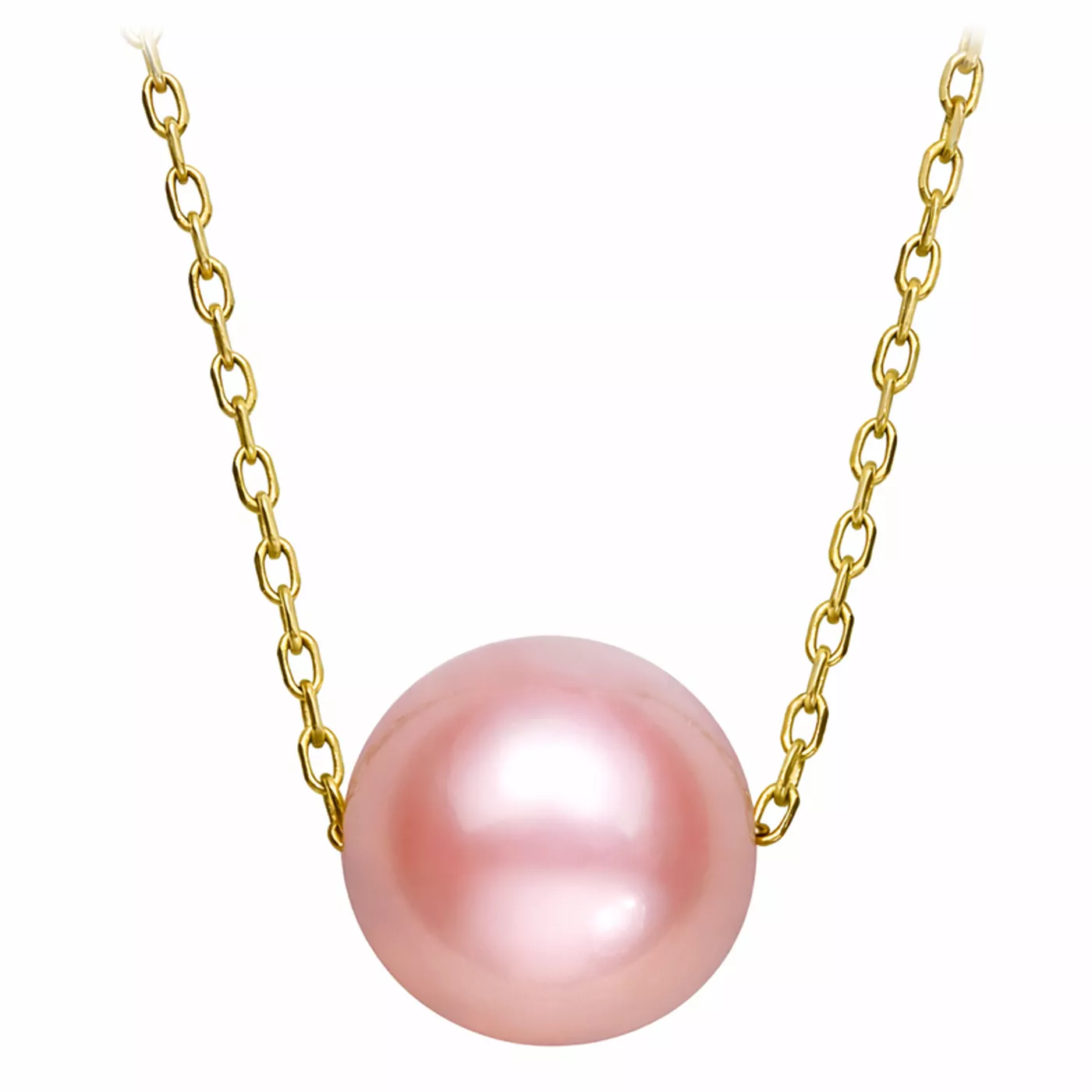 A freshwater pearl floats freely along a fine chain, showcasing natural luster and smooth surface in a clean, timeless design.